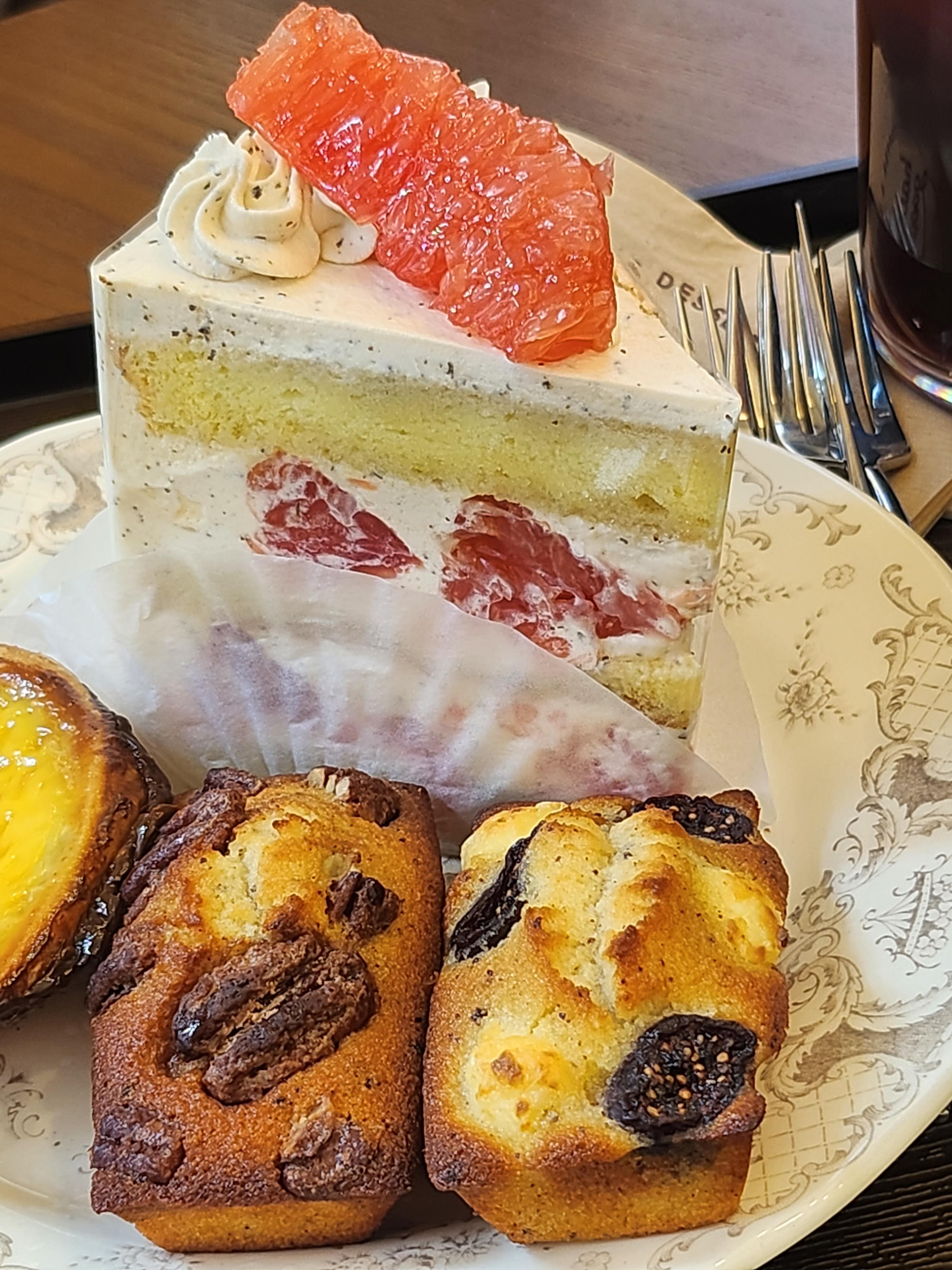 사진에서 보이는 것과 같이 자몽이 아주 큼직하게 많이 들어있고 얼그레이크림과 조합이 아주 좋았다. 생크림은 동물성 생크림을 사용하는지 미끌거림 없이 술렁술렁 넘어갔다. 같이 간 지인 두 명은 케이크를 거의 건드리지도 않았는데 나 혼자 다 먹었다. 시트도 퍽퍽함 1도 없이 퐁신하다.
