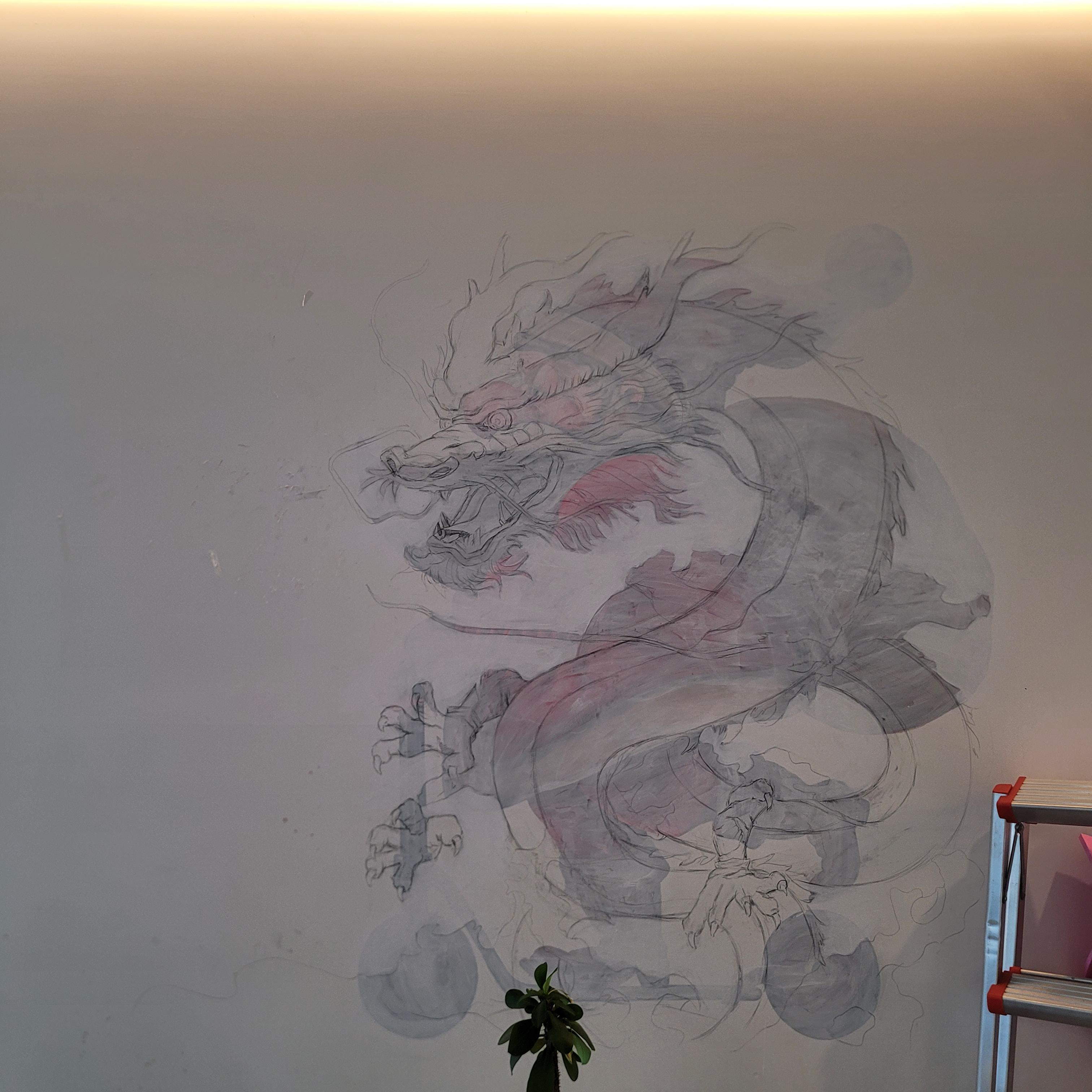 카페의 벽면에는 청룡의 해에 걸맞은 청룡 밑그림이 그려져 있었다. 검색해 보니 카페의 바로 옆에 공방이 있는데 양초공예, 유화, 수채화 그리기 등등의 교육을 진행하시는 것 같았다. 해당 공방의 블로그에 들어가 보니 이전에는 이 자리에 커다란 산타클로스가 그려져 있었고 이제는 청룡으로 탈바꿈 중인 듯했다. 카페도 운영하시면서 공방도 하시다니... 사장님이 금손이시다.