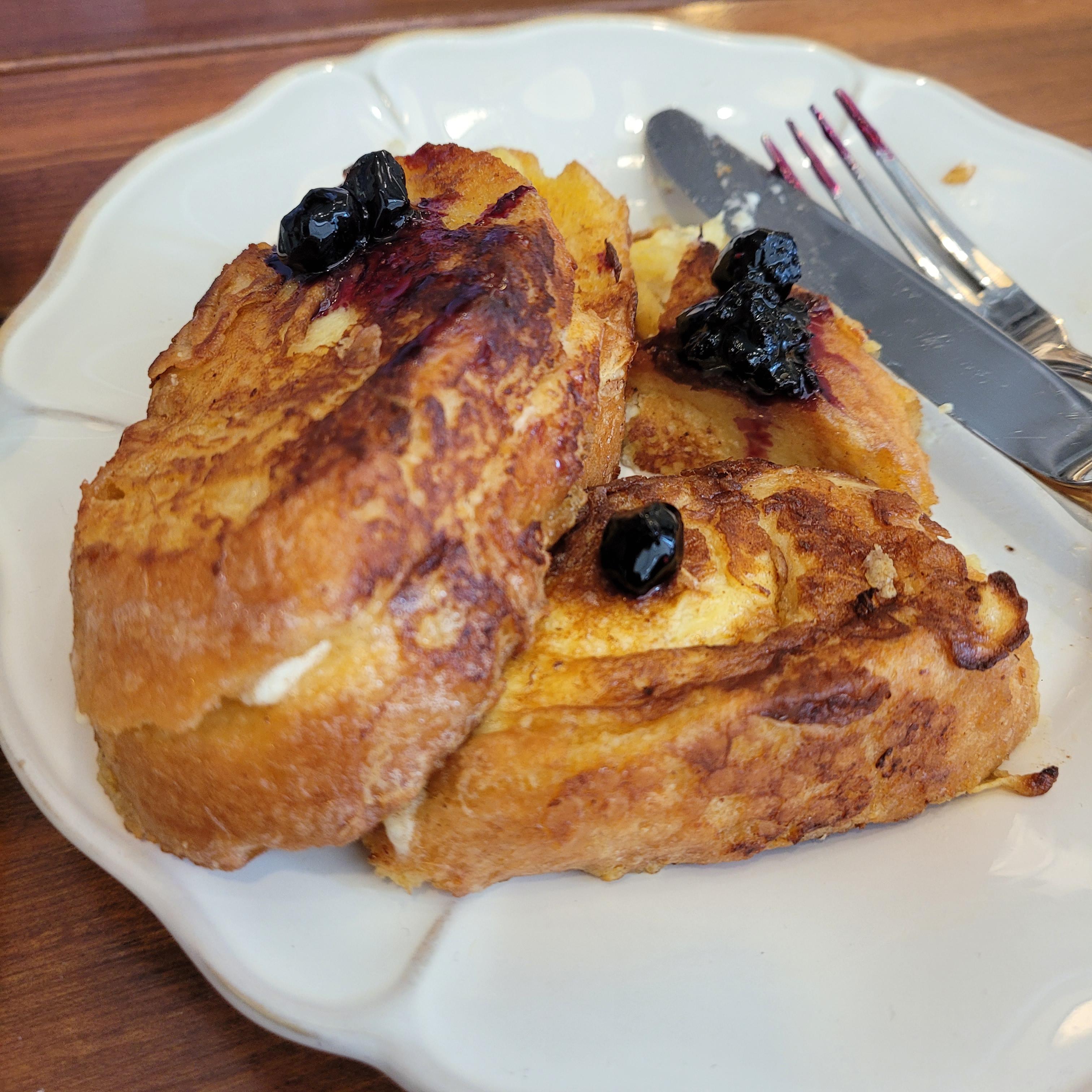 프렌치토스트를 보통 식빵으로 만드는데 여기는 바게트를 사용해서 만들었다. 식빵보다는 바게트를 더 좋아해서 마음에 들었다. 바게트 속까지 계란물이 촉촉하게 배어 있었는데 겉 부분만 살짝 질깃해서 정말 맛있게 먹었다. 그리고 그냥 먹었을 때도 적당하게 단맛이 느껴져서 사진처럼 블루베리 잼은 정말 조금만 올려서 먹었다. 저렇게만 먹어도 충분히 맛있었다. 사진을 보면 바게트와 바게트 사이에 하얀 크림? 같은 게 보이는데 정확하진 않지만 저 크림이 달달한 맛의 역할을 하는 것 같았다.