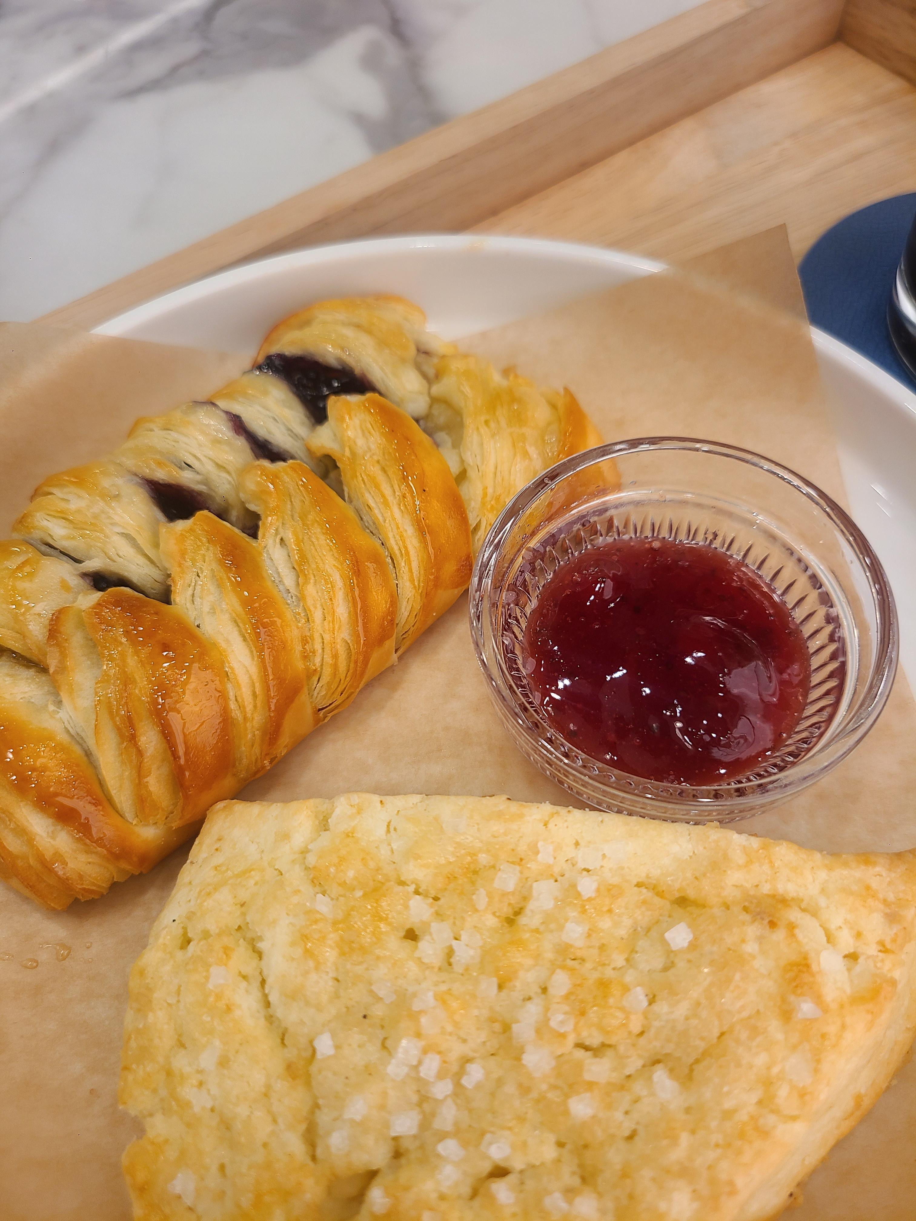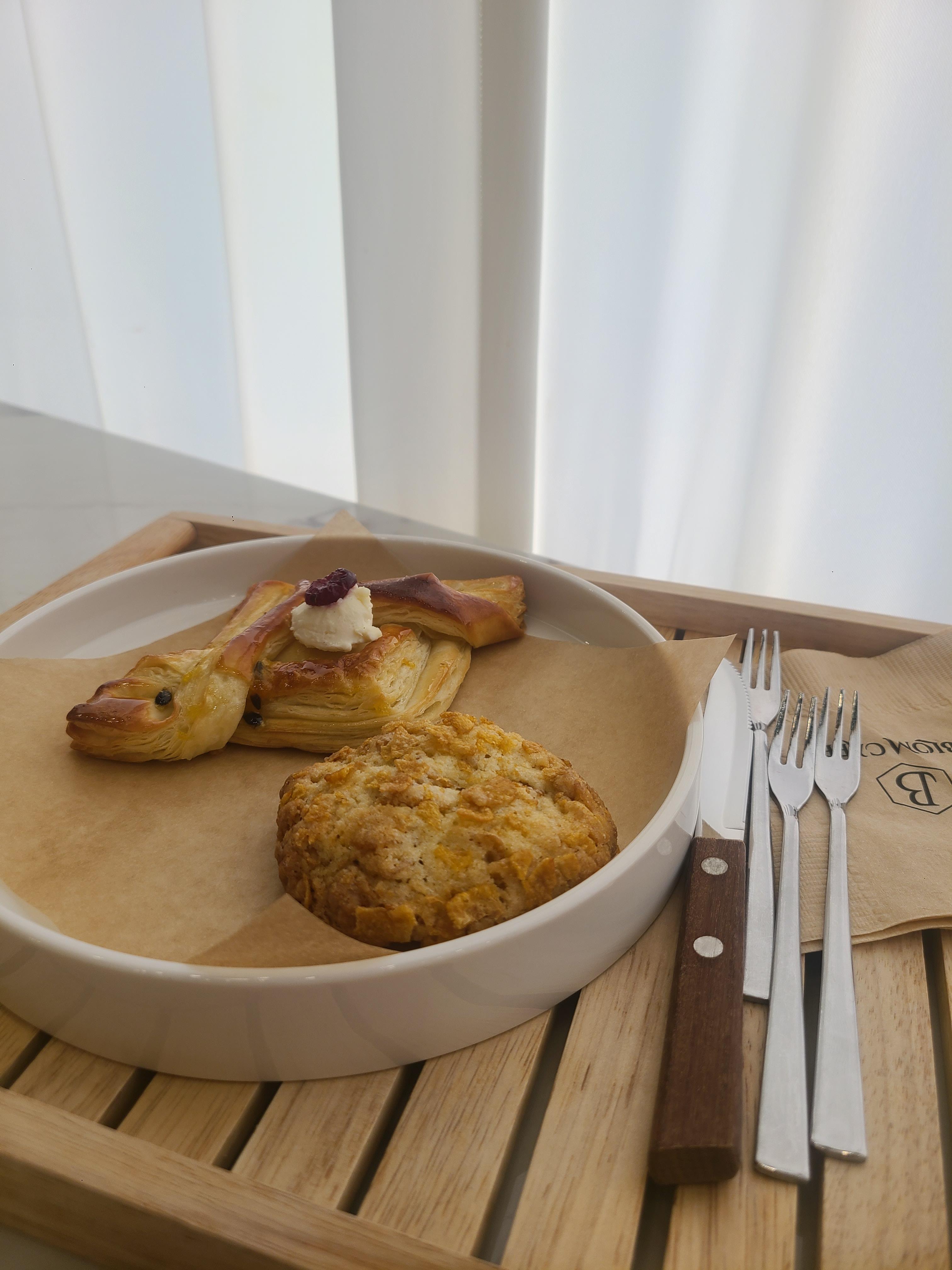 스콘과 크로와상 재질?의 빵. 솔직히 생긴 게 엄청 먹음직스러워 보이진 않아서 큰 기대 없었다. 소박하게 생겼다고 해야 하나. 하지만 먹어보고 생각은 금세 바뀌었다. 사실 남은 빵의 종류가 다양하지가 않아서 적은 선택지 안에서 골라온 건데 크로와상 같은 빵은 바삭하고 달달했고 아니 나 스콘 안 좋아하는데... 시리얼 스콘인가? 그랬는데 겉에 바삭하고 달달한 시리얼에 뻑뻑한 스콘의 조화가 예사롭지 않았다.