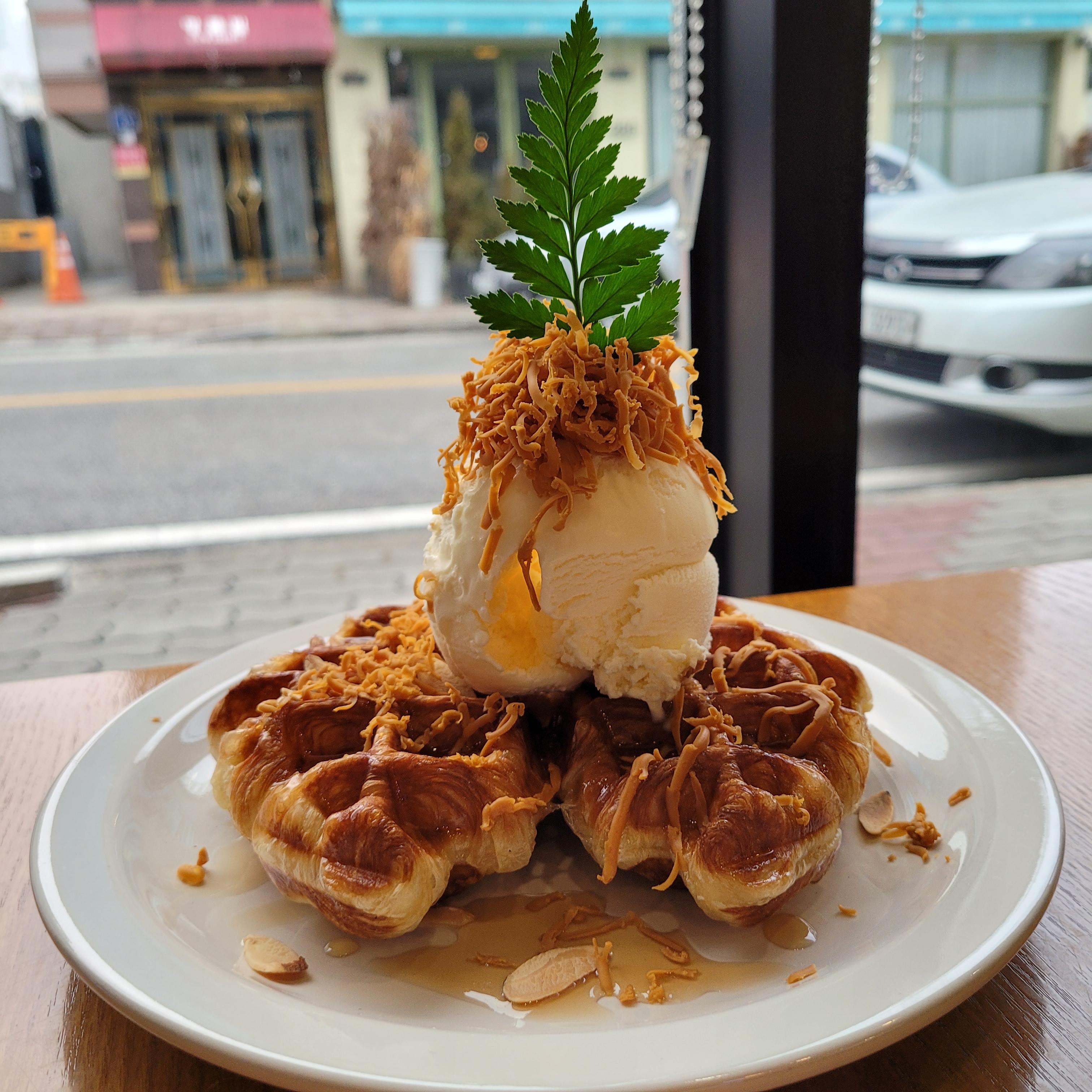 브라운치즈크로플은 그냥 비주얼 값 한다고 보면 된다. 너무 맛있어... 바삭한 크로플에 달달한 시럽, 바닐라 아이스크림과 브라운치즈를 함께 먹어주면 오지는 단짠 조합에 여기가 그냥 천국이다.